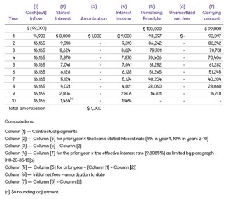 The discount factor that equates the present value of the cash inflows in Column 1 with the initial cash outflow of $99,000 is 9.8085 percent. In Year 1, recognition of interest income on the investment of $99,000 at a rate of 9.8085 percent would cause the investment to be $93,807, or $710 greater than the amount at which the borrower could settle the obligation. Because the condition set forth in paragraph 310-20-35-18(a) is not met, recognition of an amount greater than the net fee is not permitted. The loan would be accounted for as follows.