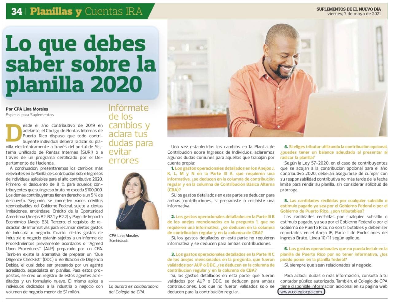 A continuación, presentaremos los cambios más relevantes en la Planilla de Contribución sobre Ingresos de Individuos aplicables para el año contributivo 2020. Primero, el descuento de 8% para aquellos contribuyentes que su ingreso bruto no exceda $100,000 . Los demás contribuyentes tienen derecho a un 5% de descuento. Segundo, se conceden varios créditos reembolsables del Gobierno Federal, sujeto a ciertas limitaciones, entiéndase, Crédito de la Oportunidad Americana (Anejos B2, B2.1 y B2.2) y Pago de Impacto Económico (Anejo B3). Tercero, el Requisito de radicación informativas para poder reclamar ciertos gastos de industria o negocio. Cuarto, ciertos gastos de industria o negocio estarán sujetos a un Informe de Procedimientos previamente acordados o “Agreed Upon Procedures” (AUP) preparado por un CPA. También existe la alternativa de preparar un “Due Diligence Checklist” (DDC) o Verificación de Diligencia Debida el cual debe ser preparado por un agente acreditado, especialista en planillas. Para estos propósitos, se creó un registro de estos agentes acreditados y un formulario nuevo. El mismo aplica a individuos dedicados a la industria o negocio con volumen de negocio menor de $1 millón.